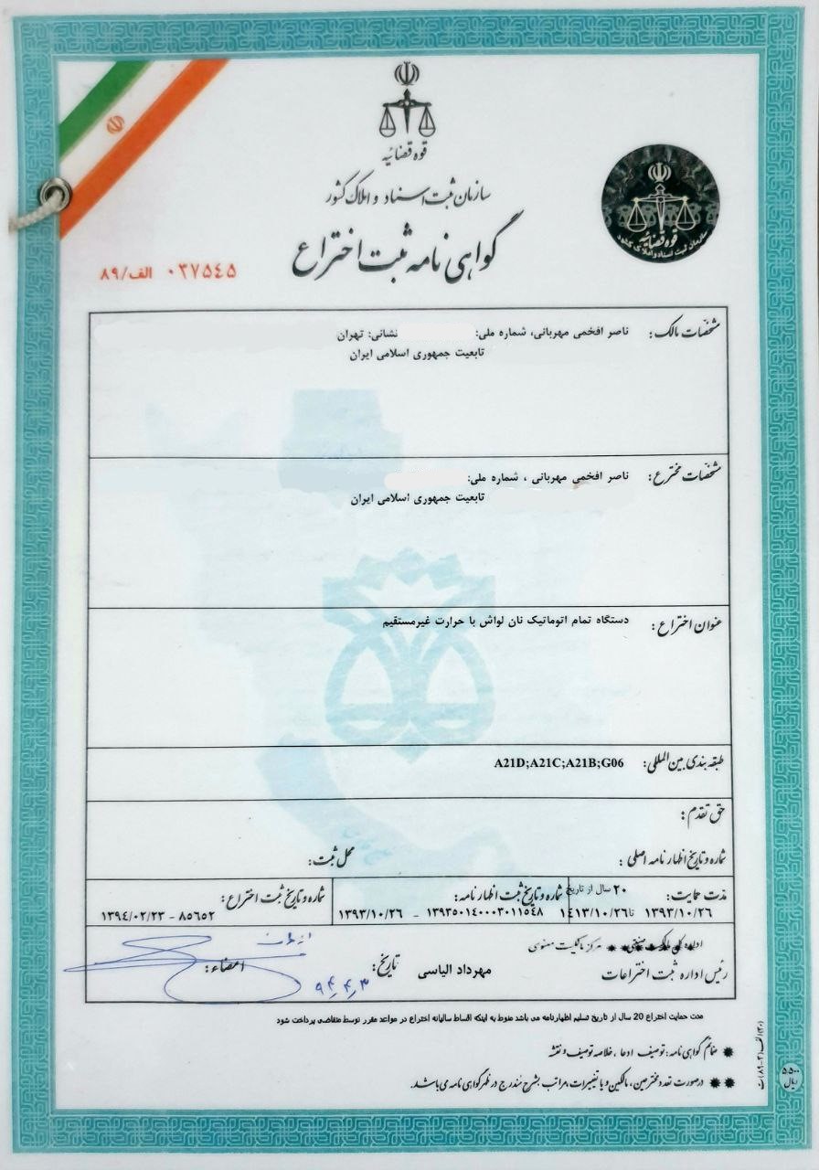 گروه صنعتی افخمی به عنوان یکی از پیشگامان صنعت نانوایی در ایران، موفق به اخذ گواهی ثبت اختراع برای طراحی و ساخت تجهیزات پیشرفته پخت نان شده است. این گواهی حاصل سالها تلاش، تحقیق و نوآوری تیم متخصص این مجموعه بوده و نشاندهنده توانمندی بالای فنی و مهندسی گروه صنعتی افخمی در ارائه راهکارهای نوین برای بهبود فرآیند پخت نان است.